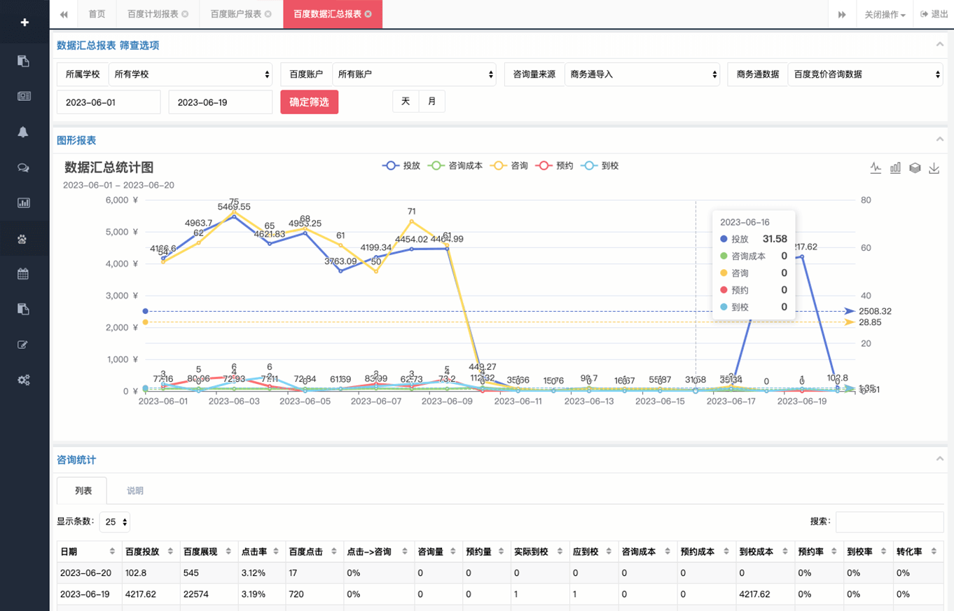 聚合百度、商務通數據,提供多種自定義生成數據報表、咨詢員報表、專業報表、推廣渠道報表、咨詢方式報表、關鍵詞報表;同時報表都可生成柱狀圖或折線圖,并且可以下載EXCLE表格。